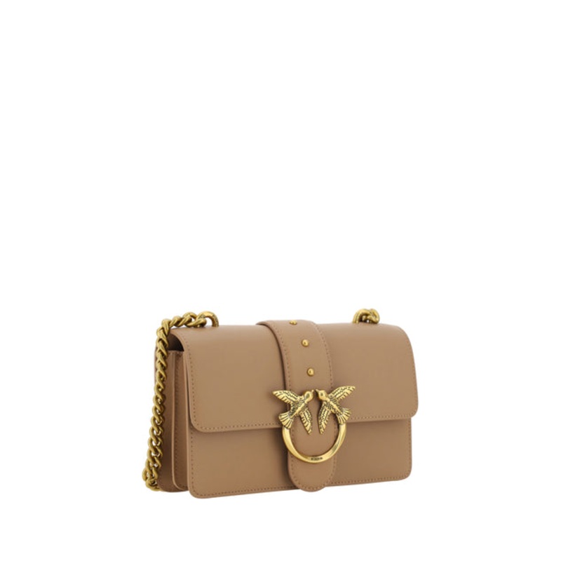 Details – Calfskin Love One Mini Shoulder Bag by Pinko, front closure with magnetic button, iconic gold-plated Love Birds logo embossed on the front, smooth leather design, double internal compartment, shoulder strap partly in leather, partly with chain, slit pocket applied on the back.